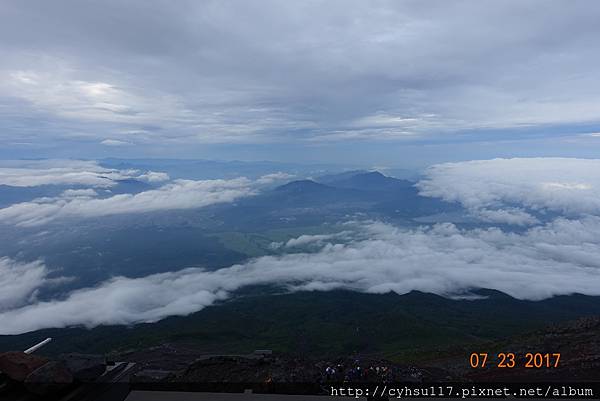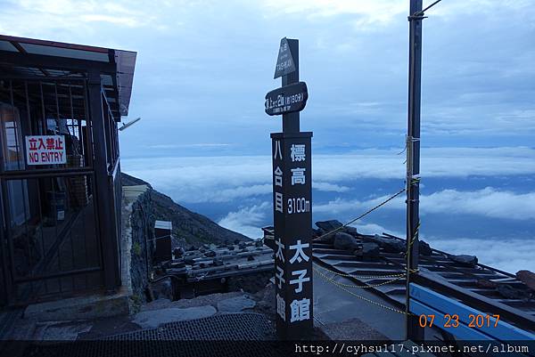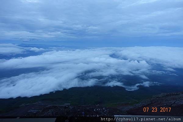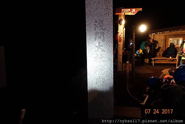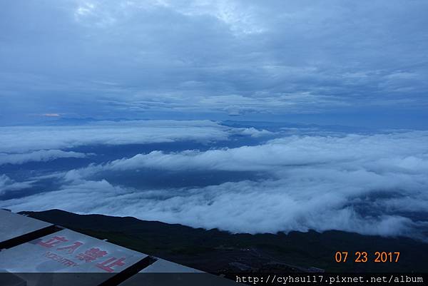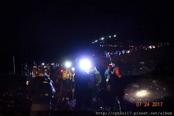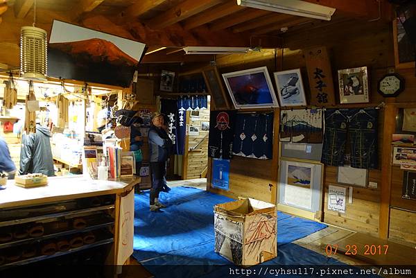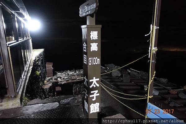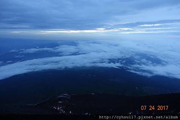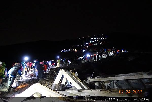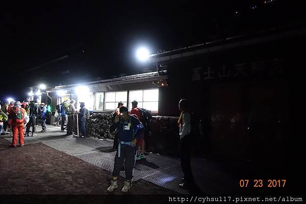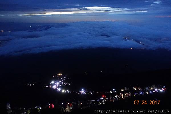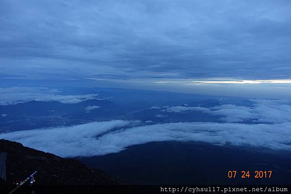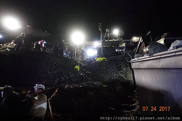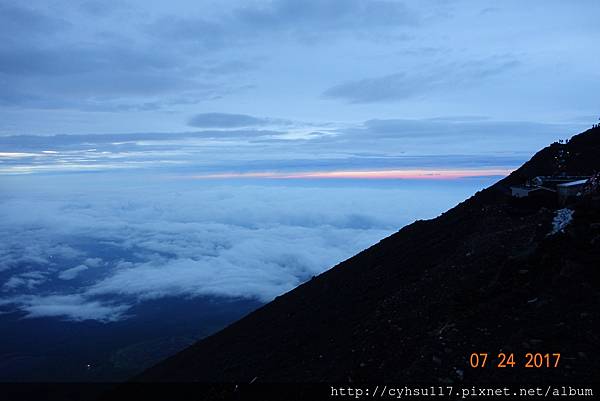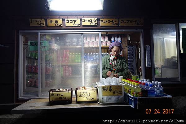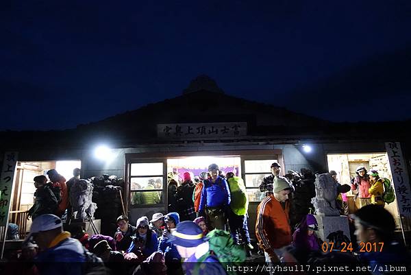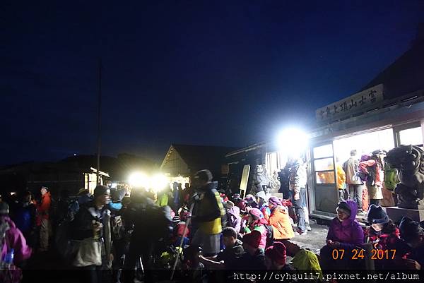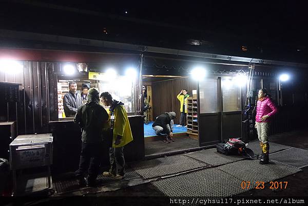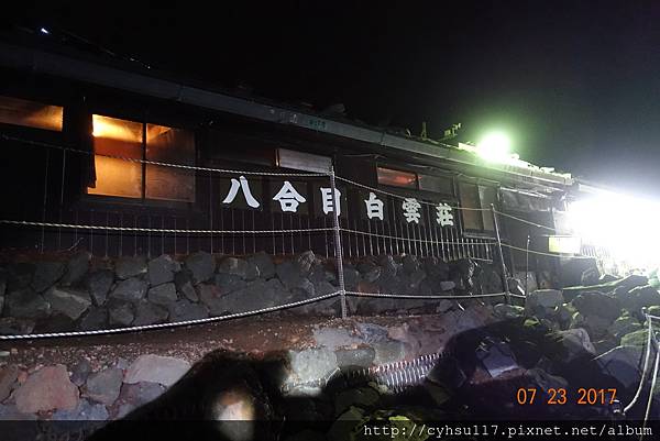 尿個尿, 我就跑去睡覺了, 其實也沒睡著, 晚上突然有些人打呼超大聲, 然後睡對面的日本小妹妹們每聽到一個打呼爆發點就一直狂笑。根本很難睡。然後旁邊的大叔一直在隔著睡袋碰我的大腿, 碰一碰就坐起來擦汗, 換衣服, 再躺下去繼續碰大腿, 媽呀, 日本除了電車痴漢, 竟然也有富士山山屋癡漢。大概閉眼躺到下午 10:40 左右我就起來了, 出去山屋逛逛