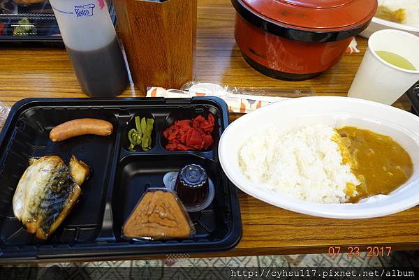 到了晚餐時刻, 餐點是咖哩飯配鯖魚, 咖哩普通, 鯖魚還滿好吃的, 配熱綠茶