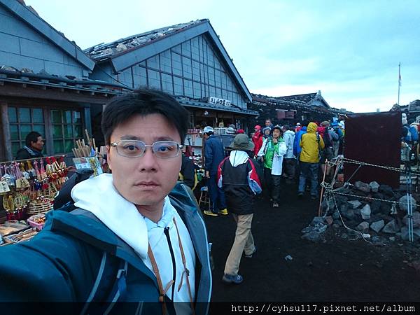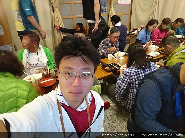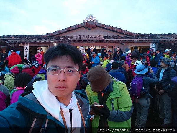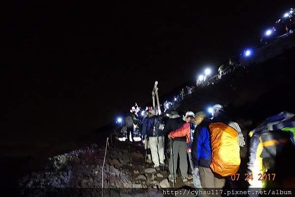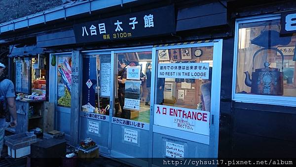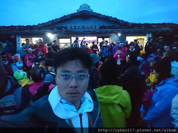 大概下午 6:00 左右辦理山屋入住(睡一晚附兩餐), 進到小木屋找到自己位置, 放好背包, 閉眼休息片刻過後, 下午 6:30 山屋工作人員便叫我們吃晚餐了(一梯一梯團體去吃), 吃完晚餐約七點多便要趕快去小木屋睡覺, 大約睡到 11 點左右便要出發登頂(大概是下午 11 點多走到早上 4 點出頭到山頂等待看日出), 但實際上小木屋很擠, 旁邊人打呼聲又很大, 其實很難睡著, 充其量只能說閉眼休息 3個多小時。走到目前為止其實對於體力的消耗是還好的, 不怎樣累, 膝蓋, 腳底也沒有疲累的感覺, 但我覺得是因為沒有發生高山症症狀的原因, 所以到目前還是感覺很輕鬆舒服。在早上旅館吃早餐時, 中午在五合目吃午餐時我各吞了一顆丹木斯, 在晚上小木屋六點多吃晚餐時我又吞了一顆, 但是到目前為止也沒有發生手麻或隨時隨地想尿的副作用。