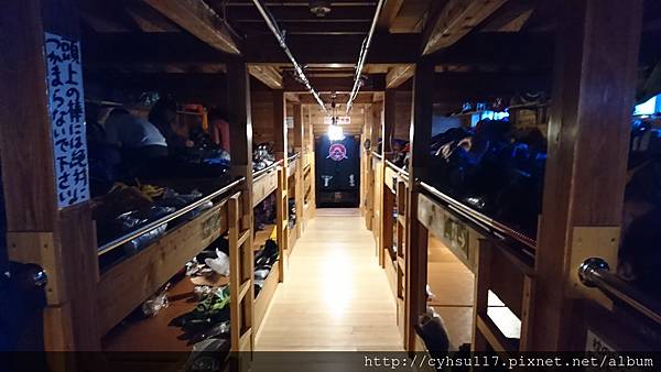 我的位置是在第二層, 樓梯很難爬, 需要身體面對梯子貼住架子滑上滑下, 因為我的小雞雞比較大, 要下去時常常會卡到小雞雞, 不舒服。望向對面, 很多日本人都已經躺著在休息了