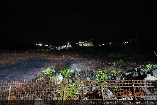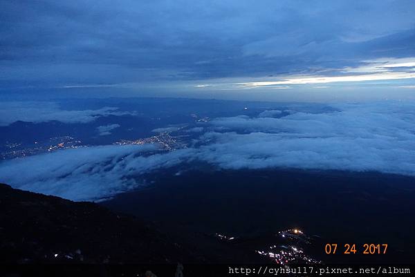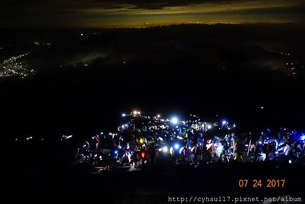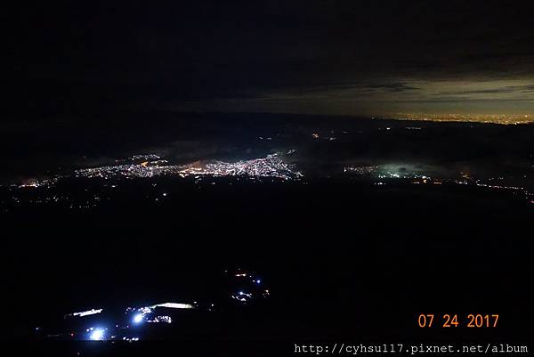 從這裡看出去的夜景, 上面的白光點是山下, 下面的白色亮點是正在爬上來的旅客