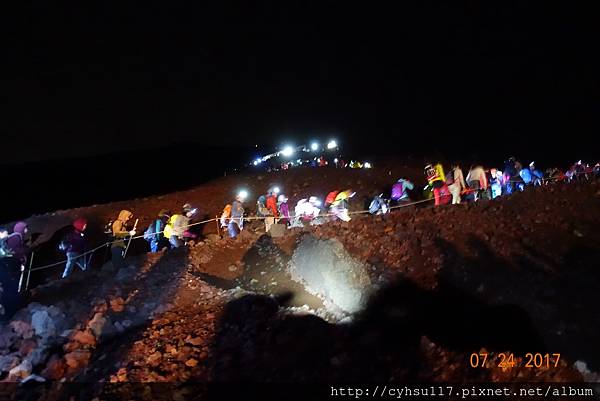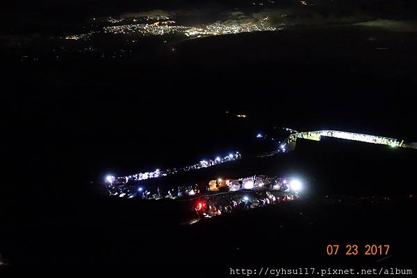 從此處往下看可以看到一串人龍沿著山路正在爬上來, 我覺得頭燈在夜間行走一定是必帶, 不然真的很按很難找踩點, 除非你的車頭燈會發亮就另當別論。