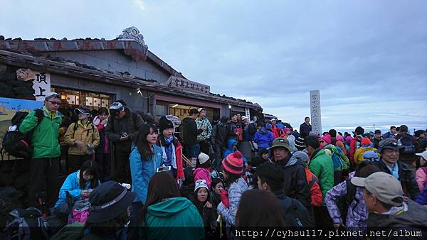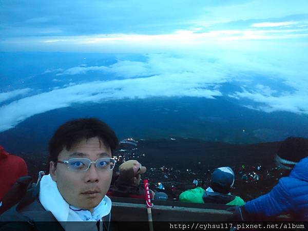 所幸哥行為快速, 燒印完之後沒做其他事情, 就快速卡到了一個最靠邊的位置(有柵欄隔開), 這個時候山頂其實不太冷, 此時我的衣物是(由內到外): uniqlo紅色排汗衫->uniqlo 米老鼠圖案發熱衣->uniqlo白色薄外套->mammut防風防水GORE-TEX外套, 這樣就滿保暖的了。在這裡欣賞了一陣子從下面爬上來的人龍, 慢慢的看著天色從暗到亮...